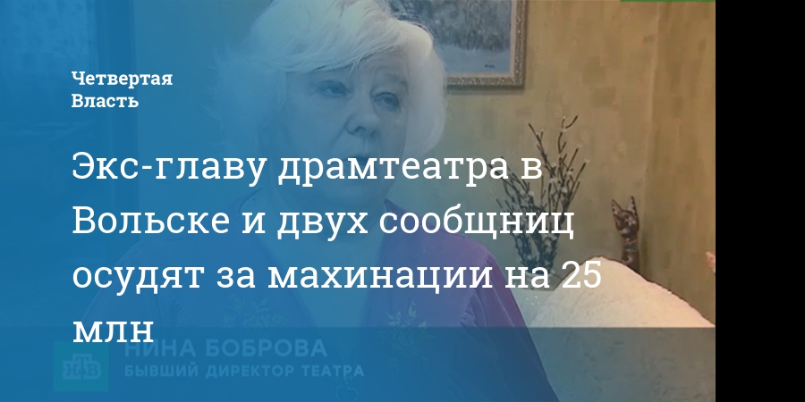 В Вольске Саратовской области передано в суд уголовное дело в отношении 70-летней бывшей руководительницы драматического театра Нины Бобровой, а также двух ее сообщниц 61 и 73 лет. Как сообщает прокуратура области, их обвиняют в махинациях на сумму 25,4 млн рублей.