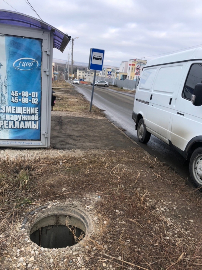 На фотографии видно, что опасность находится на улице Исаева между микрорайонами Березки и Цветочный рядом с остановкой общественного транспорта. В непосредственной близости расположен детский сад «Алые Паруса». Люк ничем не прикрыт и не огорожен.