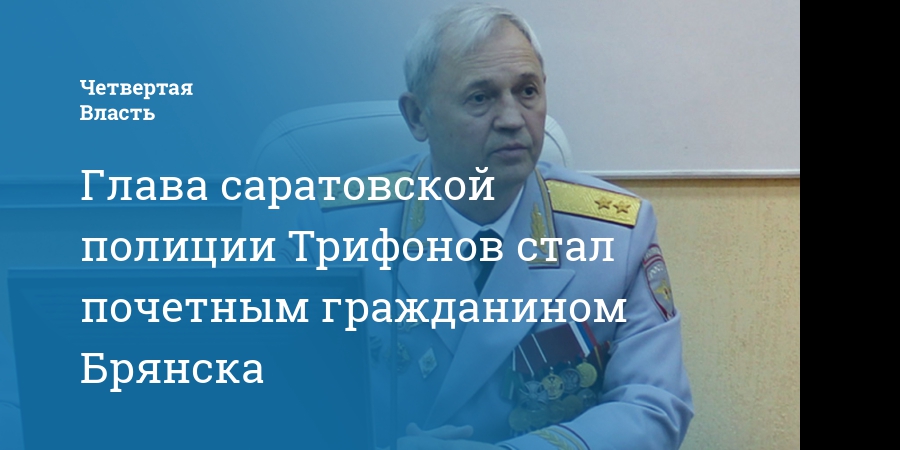 Начальник Главного управления МВД по Саратовской области генерал-лейтенант полиции Николай Трифонов стал почетным гражданином Брянска. Как сообщают местные СМИ, это решение приняли сегодня, 8 ноября, на внеочередном заседании Брянского горсовета (связано с назначением главы городской администрации).
