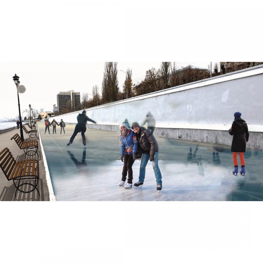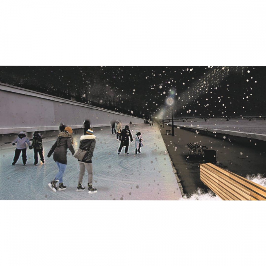 Планируется, что каток будет размещен на первом ярусе, его протяженность составит 750 м, ширина – 10 м. Здесь будут предусмотрены лавочки для отдыха горожан. Ведется работа по привлечению инвесторов для организации проката коньков, зоны фудкорта и места обогрева. Доступ на каток будет бесплатным.