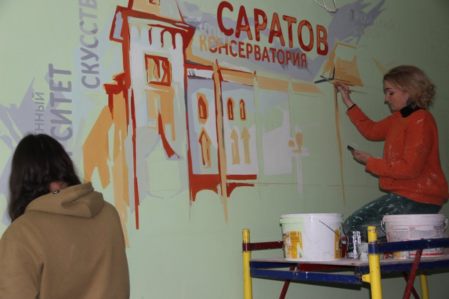 Володин прошелся по площадке около здания и посмотрел, как работы ведутся внутри. Ему понравилась расцветка стен – на нее нанесены оранжевые, зеленые краски. В одном месте художники рисуют на стене здание консерватории и надпись «Саратов». Это очень понравилось спикеру.