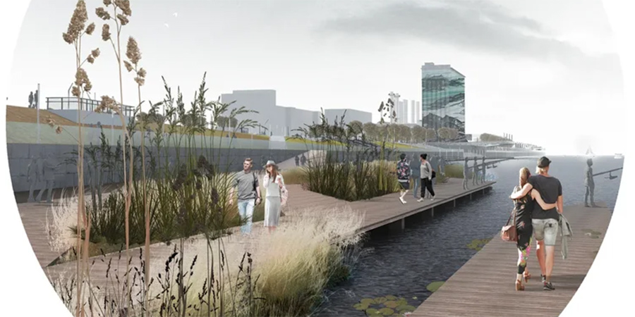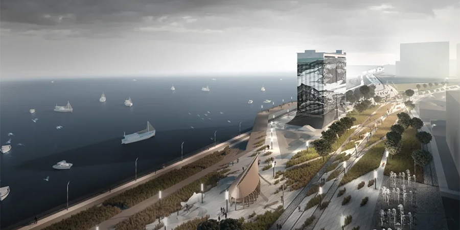 Лучшие проектировщики набережной намеревались соединить два основных периода ее истории. Зону между Бабушкиным взвозом и Вольской они хотели организовать как постиндустриальный парк, где «точкой притяжения» стало бы бывшее промышленное здание у самой воды. Тут также предполагалось организовать городскую площадь, многоуровневый пляж, большую спортивную зону и др. На участке от Дегтярной до 3-го Дегтярного проезда планировали построить яхт-клуб с деревянным пирсом и спуском к воде.