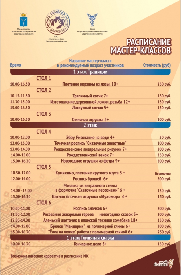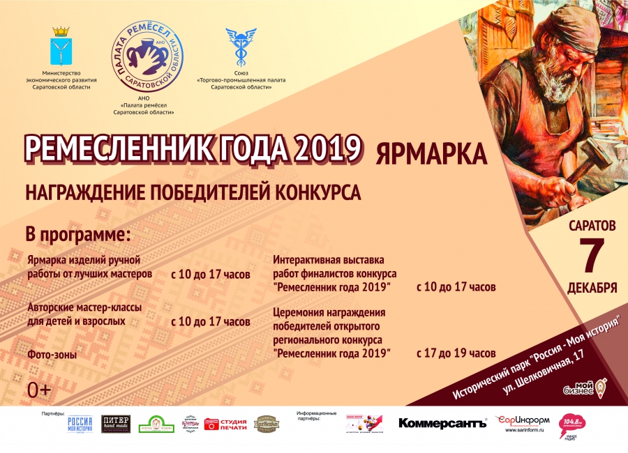 С 10 до 17 часов здесь пройдет зимняя ярмарка изделий народных мастеров и художников, а также церемония подведения итогов конкурса «Ремесленник года – 2019». Организатором мероприятия выступает АНО «Палата ремесел Саратовской области» при поддержке министерства экономического развития и ТПП региона.