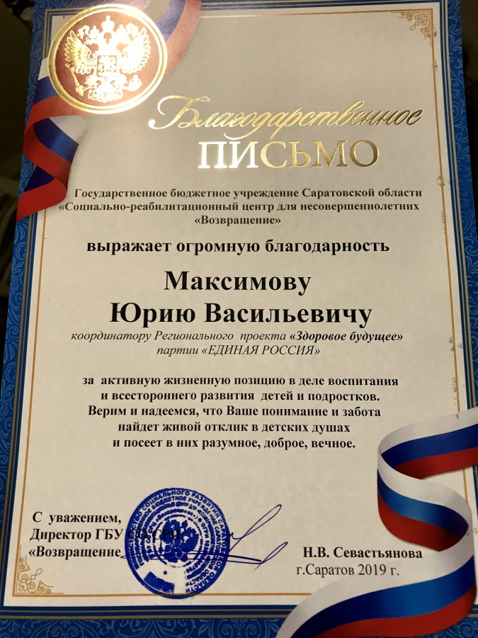 В 2020 году совместная работа реабилитационного центра и партпроекта будет продолжена, о чем уже достигнута договоренность с руководством учреждения. А итоги предыдущего периода уже подведены, и на главном предновогоднем торжестве директор центра «Возвращение» Наталия Севастьянова вручила Юрию Максимову очень трогательный подарок – благодарственное письмо «за активную жизненную позицию в деле воспитания и всестороннего развития детей и подростков».
