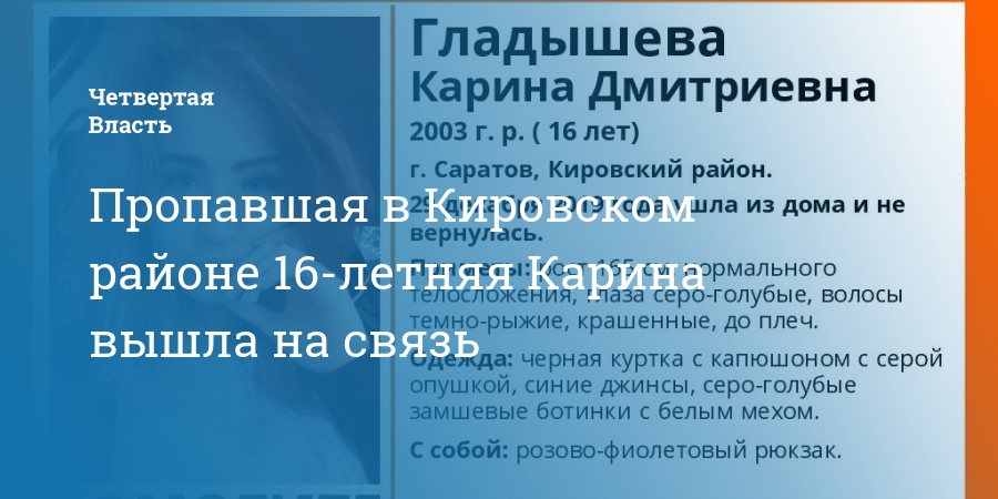 В Саратове вышла на связь 16-летняя Карина Гладышева, которую разыскивали волонтеры и полицейские. В связи с этим поиск остановлен, сообщили администраторы отряда «Лиза Алерт».