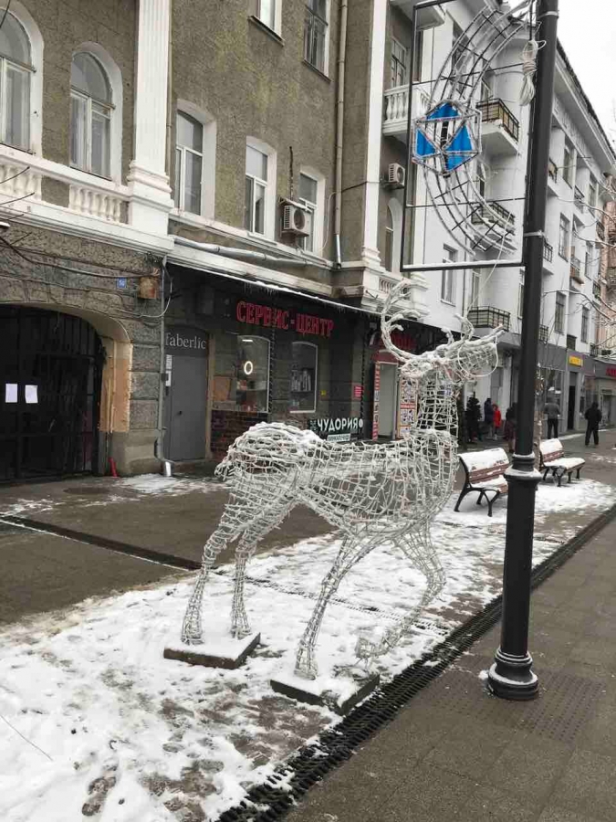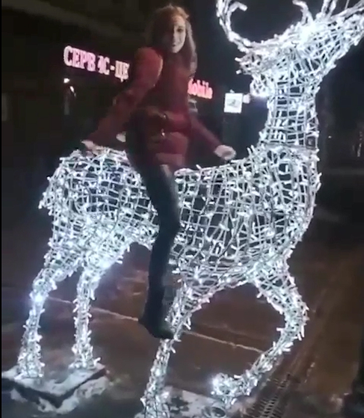 При этом конструкцию в виде оленя привели в относительный порядок. Сейчас он несколько наклонен, а также привязан с помощью проволоки – рог прицепили к креплению на столбе.