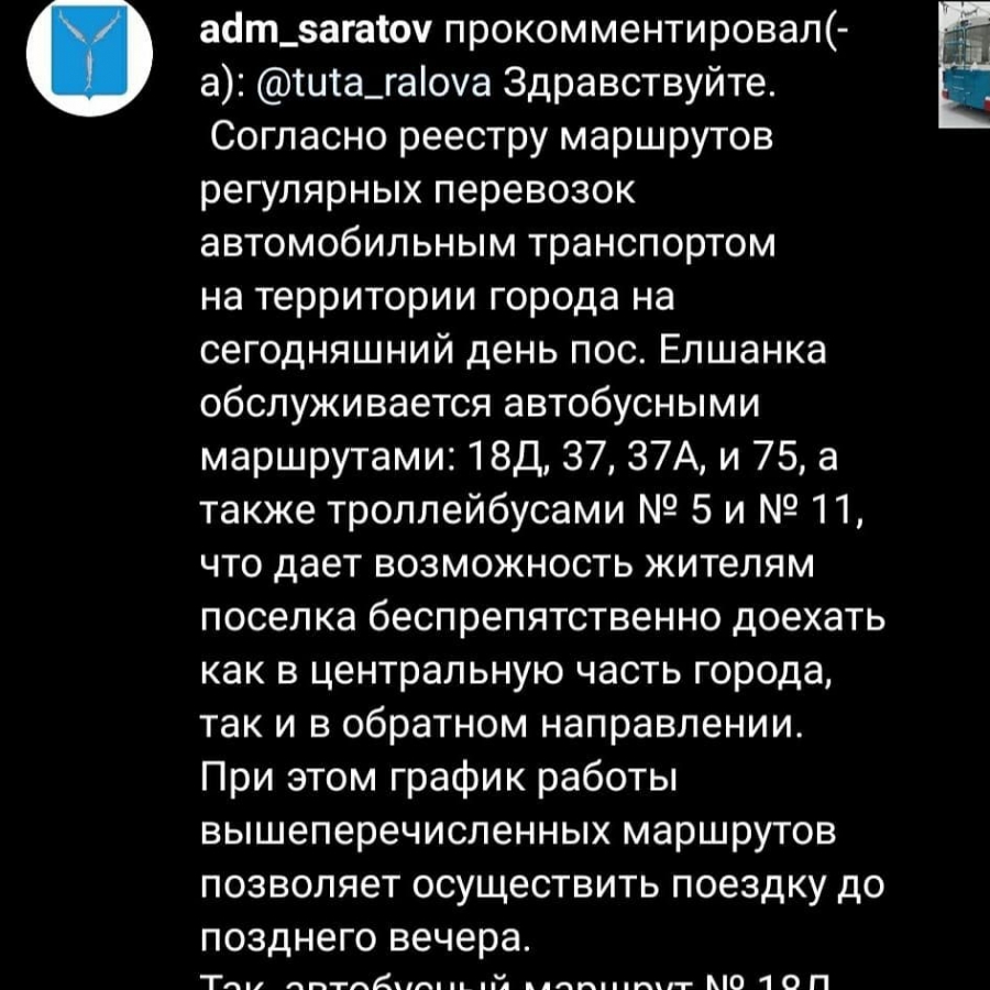 «Согласно реестру маршрутов регулярных перевозок, автомобильным транспортом на территории города на сегодняшний день пос. Елшанка обслуживается автобусными маршрутами: 18Д, 37, 37А, и 75, а также троллейбусами № 5 и № 11, что дает возможность жителям поселка беспрепятственно доехать как в центральную часть города, так и в обратном направлении.