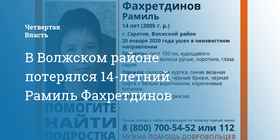 В Волжском районе Саратова потерялся 14-летний Рамиль Фахретдинов. Об этом сообщает поисковый отряд «Лиза Алерт».
