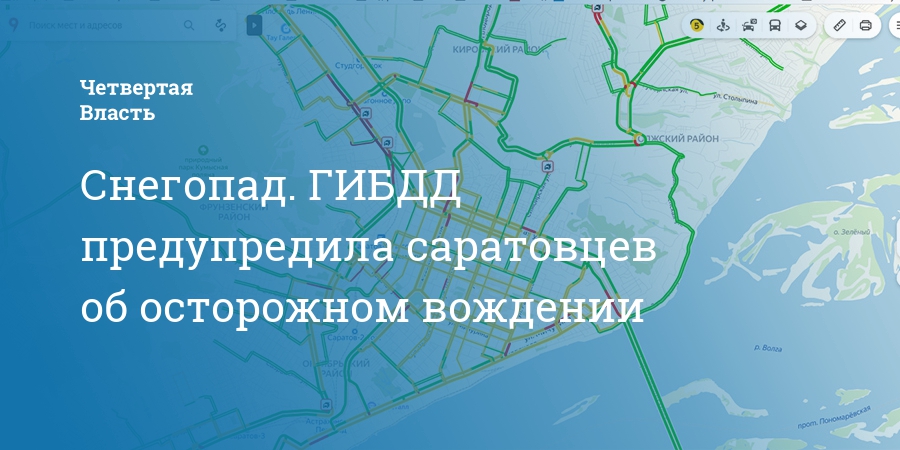 В Саратове из-за снегопада наблюдается сложная транспортная обстановка. Об этом свидетельствуют данные приложения «Яндекс.Пробки», которое оценивает загруженность улиц на 5 баллов (что означает «движение плотное»).