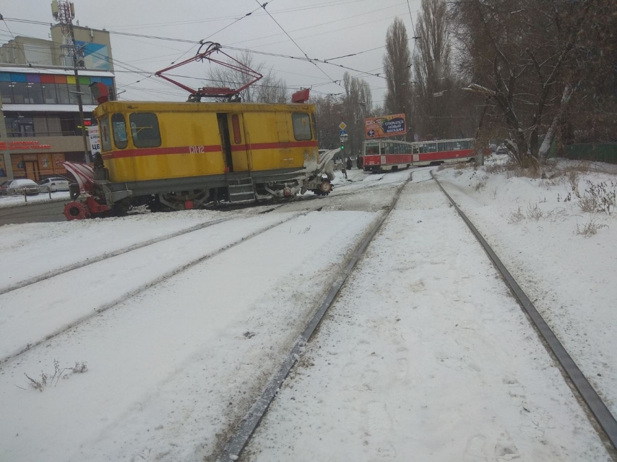 Трамвай-снегочист сошел с рельсов и блокировал движение вагонов