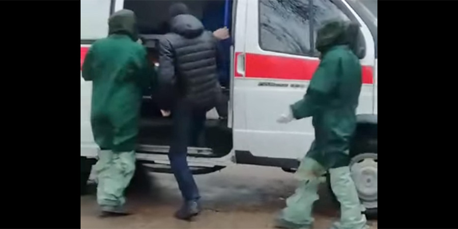 На кадрах видно, что мужчину сопроводили люди в специальных защитных костюмах с противогазом. Гражданин сел в скорую медицинскую помощь, после чего машина уехала. Предварительно, его увезли на обследование и тест на коронавирус.
