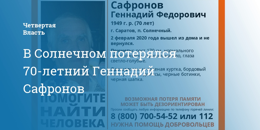 В поселке Солнечный города Саратова пропал 70-летний Геннадий Сафронов. Об этом сообщают волонтеры поискового отряда «Лиза Алерт».
