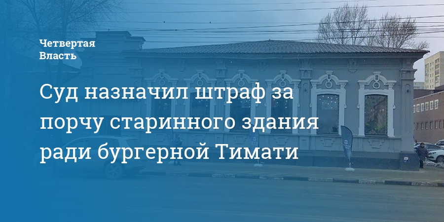 Кировский районный суд Саратова назначил наказание собственнику старинного здания, которое испортили во время обустройства там бургерной «Black Star Burger». Об этом сообщила «Четвертой Власти» пресс-секретарь областного управления по охране объектов культурного наследия Анна Севрюкова.