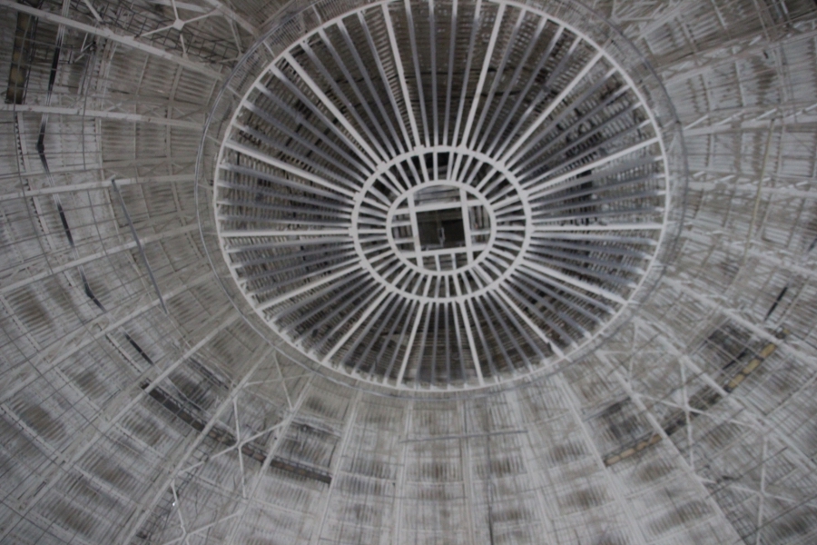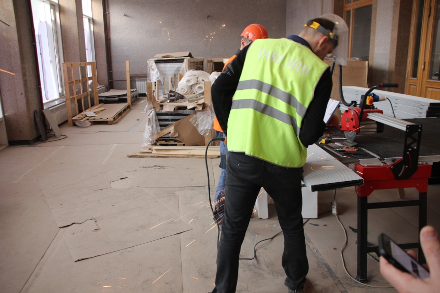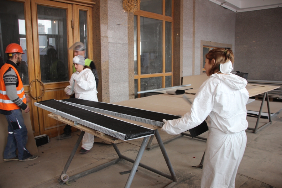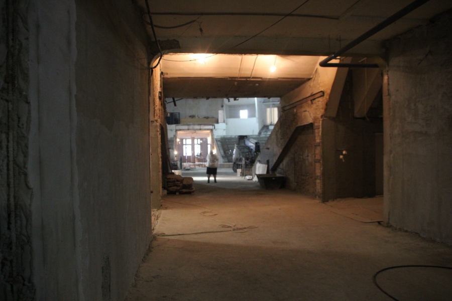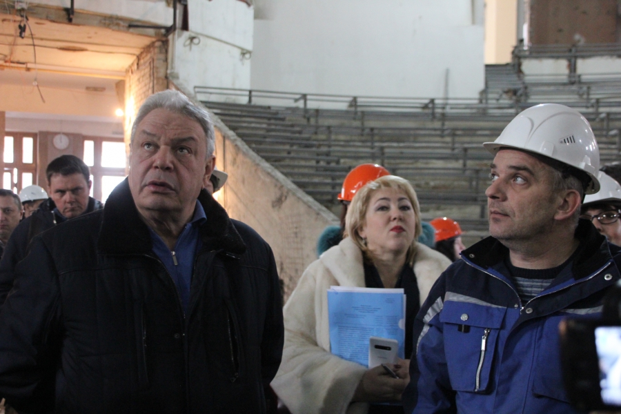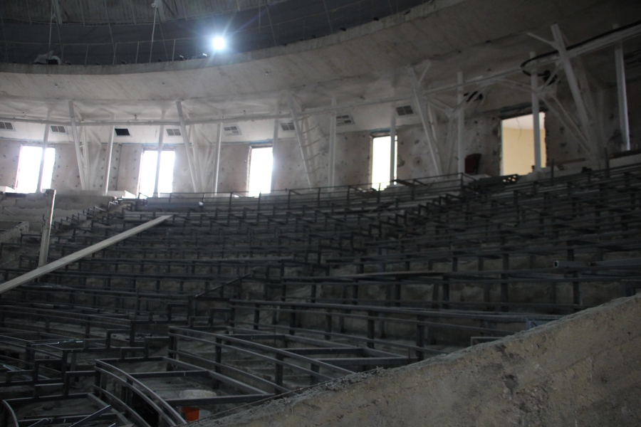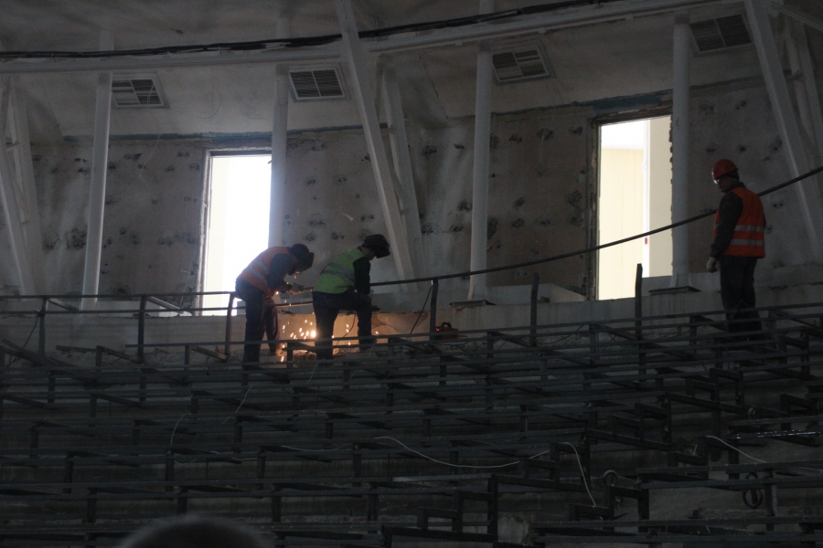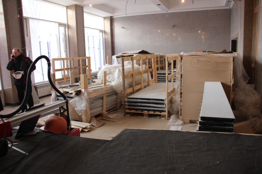 «Геометрии купола нет, поэтому пришлось все индивидуально. Усилений металлической конструкции купола не проводилось. Все хорошо. На сегодняшний день на объекте работает 33 человека. Есть перебои со строительными материалами - штукатурка. Подрядчик подвел. Вот сейчас другой приедет. Здесь по пожарным нормам переделаны зрительные места. Потеряли мы два ряда кресел. Но это противопожарная норма. Сейчас будет вмещать порядка 1850 человек», - продолжил рассказывать об этапе строительства Алексей Кочуров.