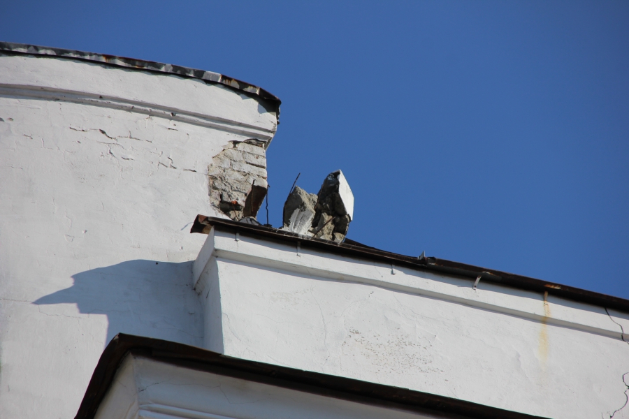 В Саратове крыша одного из домов на пешеходной улице Волжской стала представлять реальную опасность для пешеходов: от парапета откололся большой кусок штукатурки.