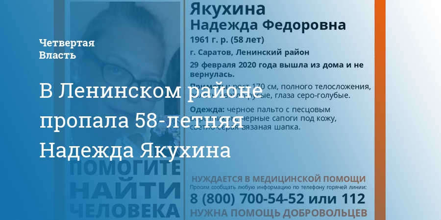 В Ленинском районе Саратова пропала 58-летняя Надежда Якухина. Об этом сообщают волонтеры поискового отряда «Лиза Алерт».
