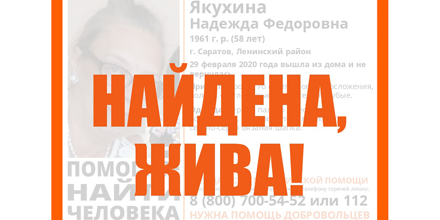 Пропавшая в Ленинском районе Саратова 58-летняя Надежда Якухина найдена живой. Об этом сообщают участники поискового отряда «Лиза Алерт».