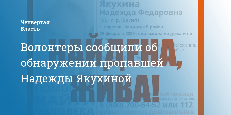 «Найдена, жива Якухина Надежда Федоровна. Всем спасибо. Просьба снять репосты», - написали волонтеры.