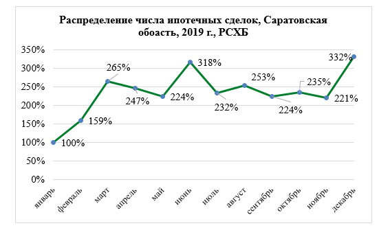 Анализ активности клиентов показал, что при минимальной активности в январе, связанной с объективным замедлением экономических процессов на фоне праздников, жители Саратовской области постепенно покупали все больше квартир. Первый пик наблюдается в марте (число заключенных договоров более чем в два с половиной раза превышает значение января), второй – на июнь (троекратно). Максимум пришелся на декабрь 2019 года: квартир было куплено в 3,3 раза больше, чем в начале года.