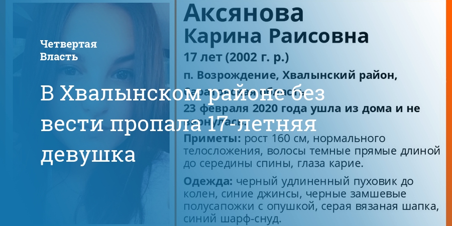 В Хвалынском районе Саратовской области организован розыск 17-летней жительницы поселка Возрождение Карины Аксяновой. Информацию об этом сегодня, 13 марта, опубликовало поисковое сообщество «Лиза Алерт».