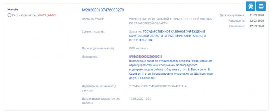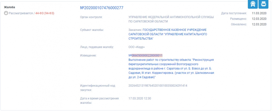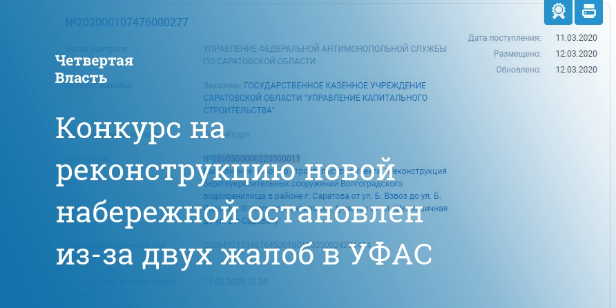 Конкурс на работы по реконструкции третьей очереди строительства набережной Саратова был остановлен после двух жалоб УФАС. Об этом свидетельствует сайт госзакупок.