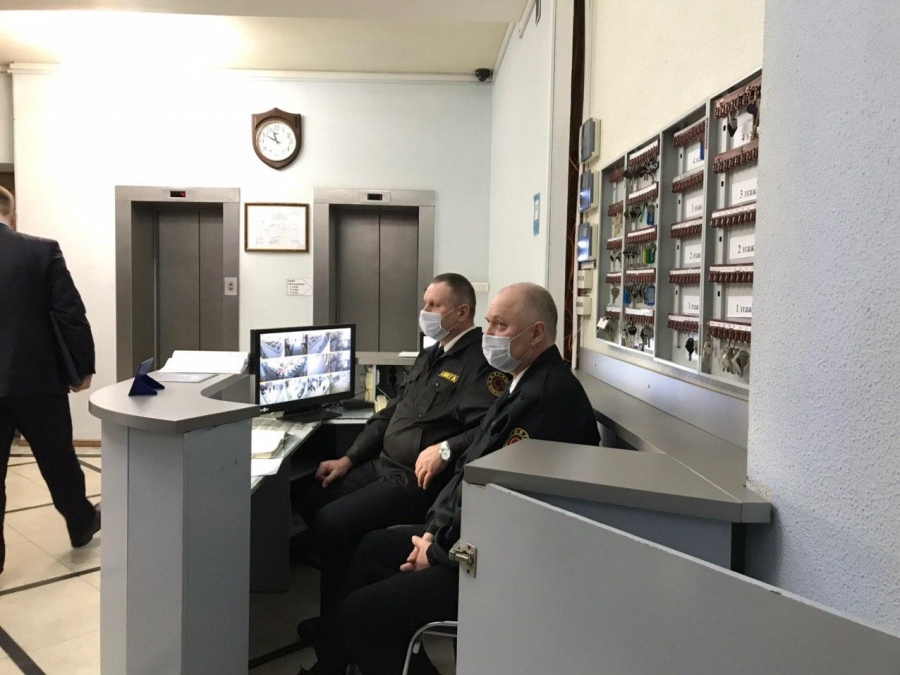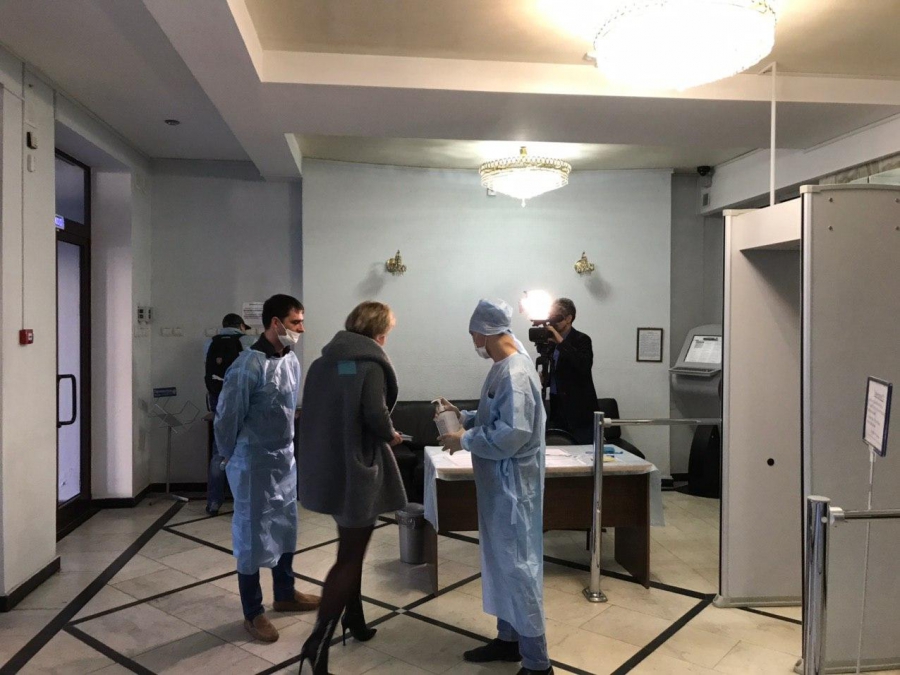 При этом люди в защитных масках поясняют входящим: «Все мероприятия проводятся в рамках борьбы распространения инфекционных заболеваний».