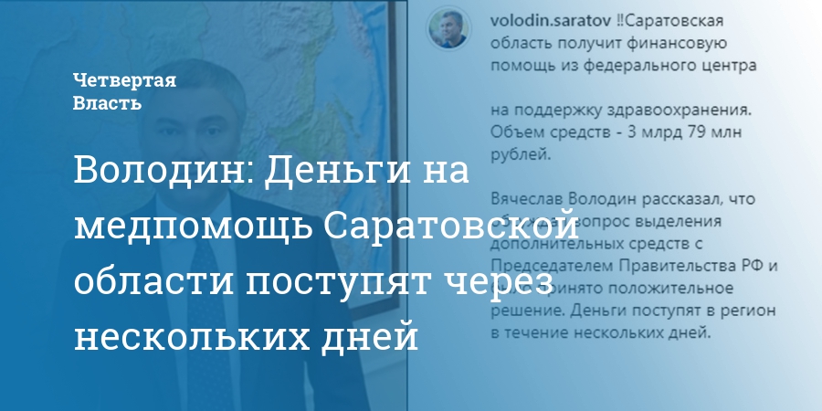 Деньги, необходимые для поддержки здравоохранения Саратовской области, поступят уже через несколько дней. Об этом сообщил председатель Госдумы Вячеслав Володин в инстаграм-аккаунте volodin.saratov.