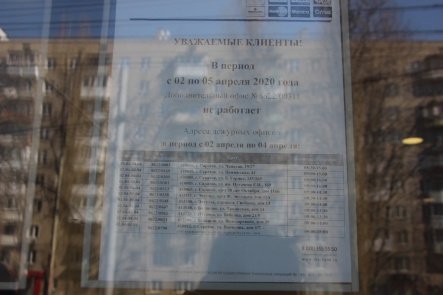 Многие отделения банков престали обслуживать физических лиц в связи с требованиями самоизоляции, но на дверях указаны адреса, куда могут обратиться горожане. Однако доступ к банкоматам остается свободным и очередей к ним нет.