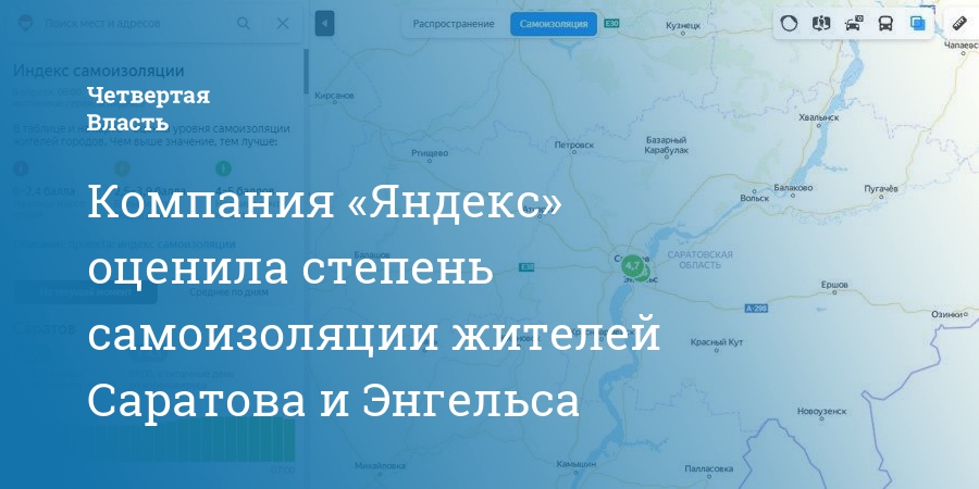 Отметим, что компанией был разработан индекс для оценки уровня самоизоляции в российских городах. На главной странице проекта представлены показатели по всем городам страны, где уровень населения превышает миллион человек. Также есть отдельная вкладка на «Яндекс.Картах» для городов с населением от 100 тысяч человек. В Саратовской области на данный момент в рейтинг попали только Саратов и Энгельс.