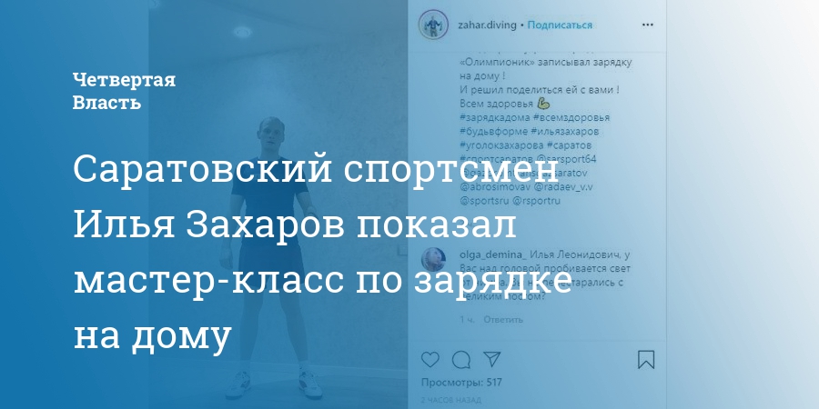 Олимпийский чемпион Илья Захаров показал саратовцам, как поддерживать себя в форме, будучи в самоизоляции из-за коронавируса. Видео он выложил в своем аккаунте Инстаграм.