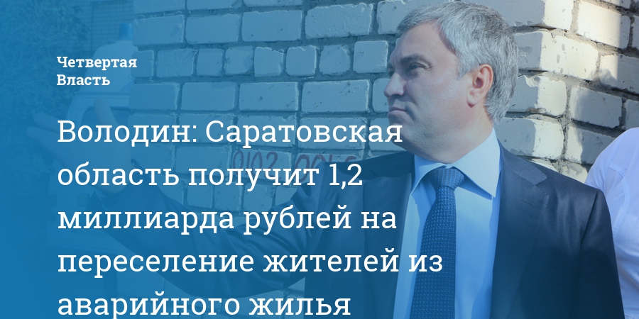 В Саратовской области из аварийного и ветхого жилья будет переселен 1841 человек, а на эти цели будет выделено 1,2 миллиарда рублей. Об этом заявил председатель Государственной думы Вячеслав Володин, видео с заявлением публиковано на странице volodin.saratov в «Инстаграме*».