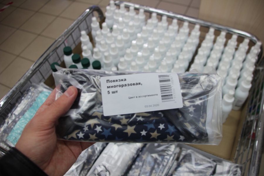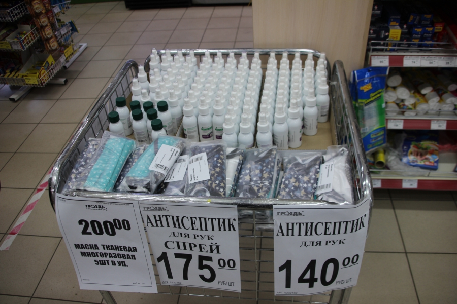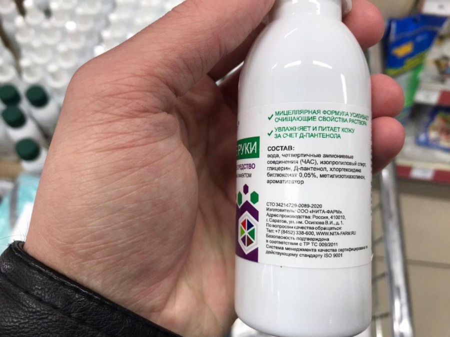 В розничной сети продают антисептический гель по цене 140 рублей за 100 миллилитров и в том же объеме спрей за 175 рублей. Также рядом с лотком антисептических средств продают сшитые из кусочков не самой дорогой ткани маски по 200 рублей за 5 штук. Производит антисептики компания «Nita-farm», которая зарегистрирована на территории Саратовской области. Так что антисептики можно назвать местными. На масках же маркировки не было, но, если верить каналу «СтопКоронавирус Саратов», их произвела местная мебельная фабрика «Король диванов».