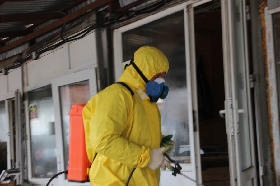 Далее между торговых рядов появился человек в желтом противоинфекционном костюме, который начал разбрызгивать антибактериальное средство. Он обрабатывал прилавки и места работы продавцов.