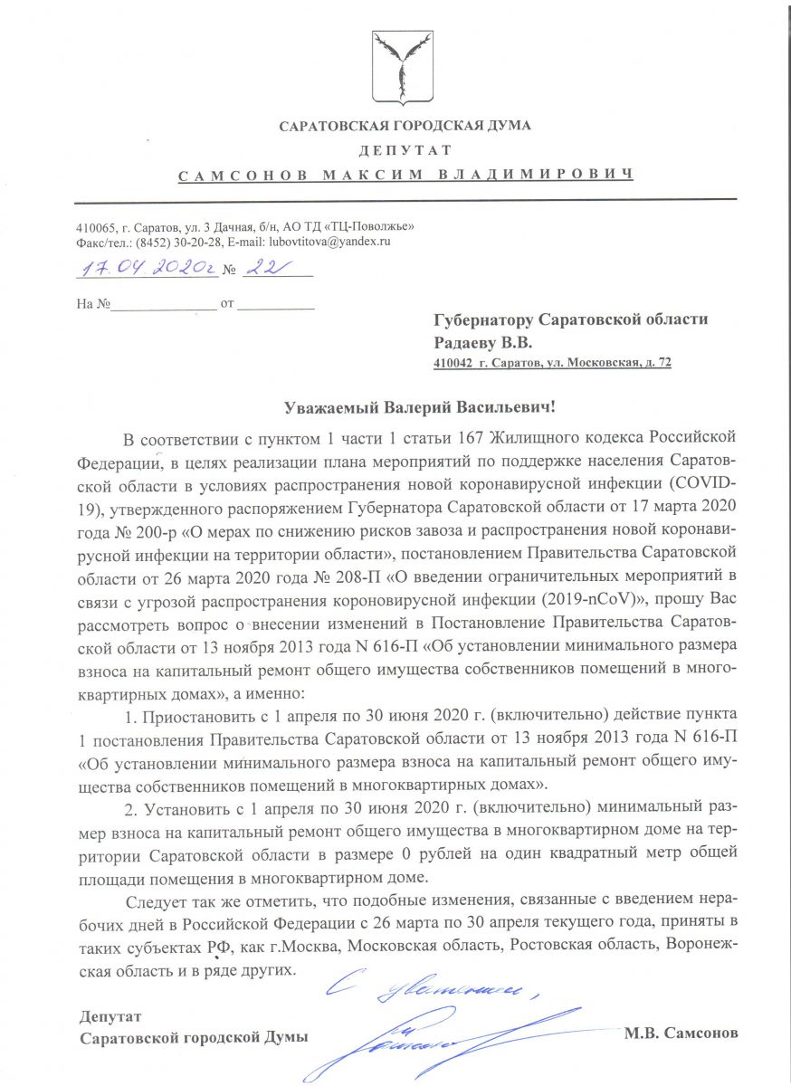 Депутат Саратовской городской думы от партии «Справедливая Россия» Максим Самсонов выступил с обращением к губернатору Саратовской области Валерию Радаеву, в котором просит приостановить с 1 апреля по 30 июня 2020 года взимание с жителей региона взносов на капитальный ремонт общего имущества собственников помещений в многоквартирных домах.
