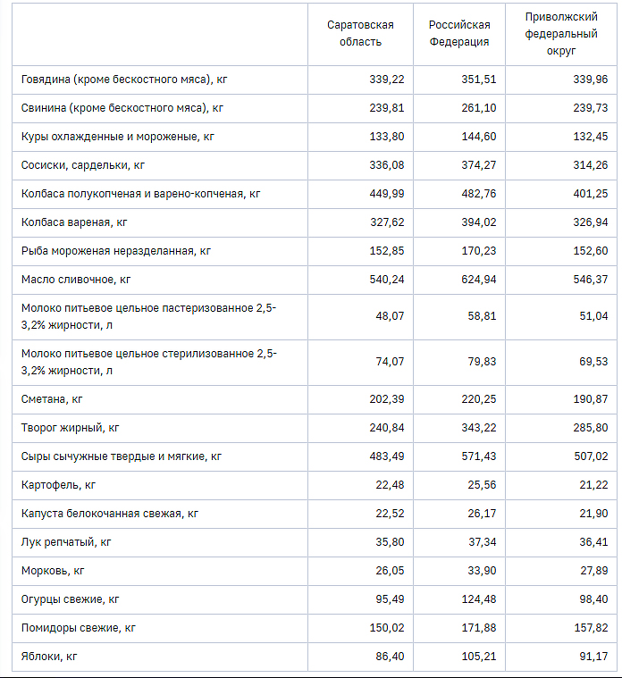 Кроме того, превышение наблюдается у свинины – 239,81 рублей за килограмм (в ПФО – 239,73), кур охлажденных и мороженных – 133,8 (в ПФО – 132,45), рыбы мороженой неразделанной – 152,85 (в ПФО – 152,6), картофеля – 22,48 (в ПФО – 21,22), капусты белокочанная свежая – 22,52 (в ПФО – 21,9).