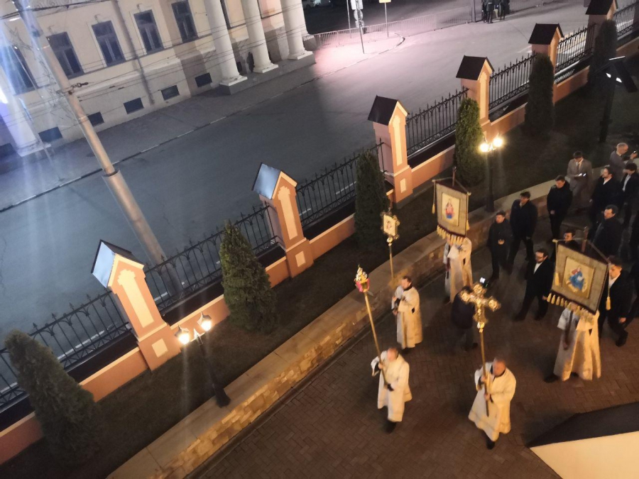 Как сообщает председатель редакционного совета «Четвертой власти» и депутат областной думы Вадим Рогожин, присутствующий на богослужении, весь храм разделен красными полосками, отделяющими пространство на полтора метра. Из вип-прихожан только он и его коллега по думе Юлия Литневская. Перед началом пасхальной службы владыка пояснил, что по данному им обещанию властям на крестный ход могут пойти только священнослужители.