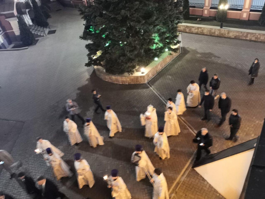 Во дворе стоит полиция и в храм не пускает, предлагая прихожанам стоять перед ним и слушать трансляцию из храма. Те кто сумел войти в собор, видимо были пущены по особому приглашению.