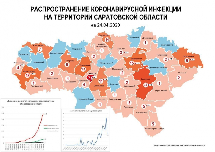 Общее количество лабораторно подтвержденных случаев инфекции в регионе – 245, за сутки – 16. География заболеваемости в области за сутки не изменилась. Наибольший прирост больных за сутки – в Саратове (плюс 4 случая), Балаковском (плюс 2), Балашовском (плюс 2) и Ершовском (плюс 2). Между тем есть районы, где коронавирус до сих пор не выявили: Турковский, Аркадакский, Екатериновский, Петровский, Красноармейский, Советский, Воскресенский, Хвалынский, Ивантеевский, Краснопартизанский.