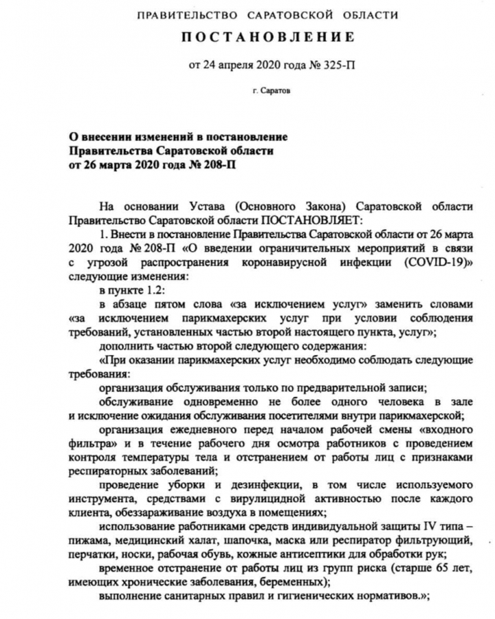 Напомним, что согласно постановлению правительства Саратовской области, парикмахерским можно начинать свою работу уже с сегодняшнего дня, однако с некоторыми оговорками. К примеру, парикмахерским разрешено обслуживать клиента только по предварительной записи и не более одного человека за раз, чтобы избежать скопления людей.