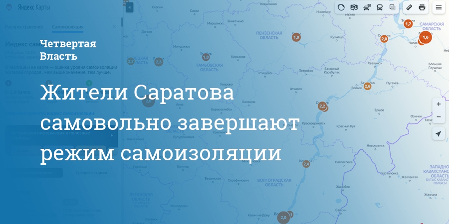 Жители Саратова все больше стали выходить на улицы города, несмотря на введенные ограничения и режим всеобщей самоизоляции. Согласно сервису «Яндекс.Карт», сейчас индекс самоизоляции составляет всего 2,2 из 5.