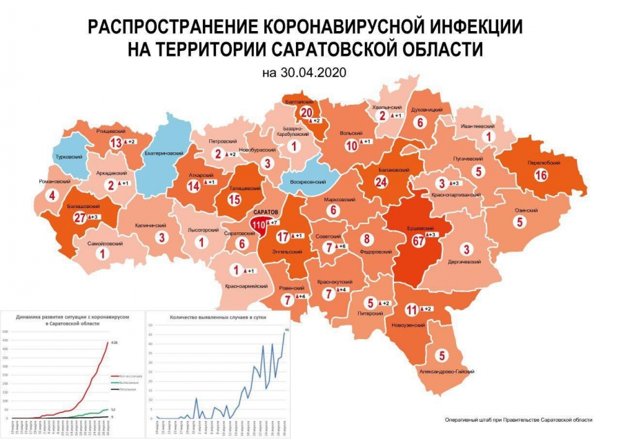 В общей сложности на территории Саратовской области обнаружили 438 зараженных коронавирусом (за сутки +46). Из них 52 вылечились, еще 3 пациента умерли от коронавируса, 7 – от других причин.