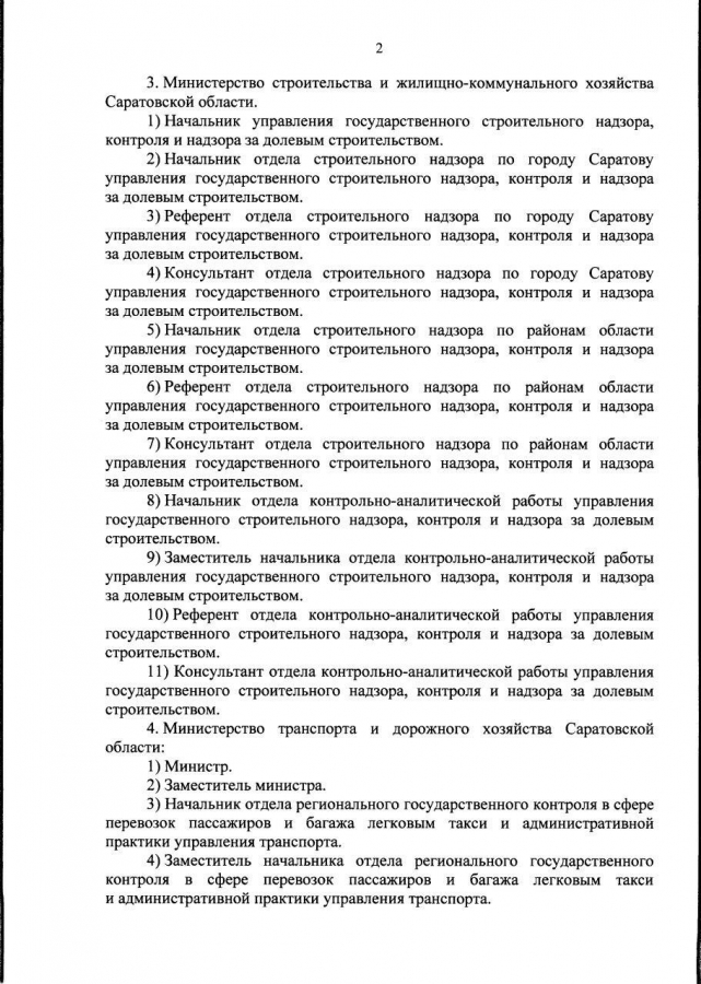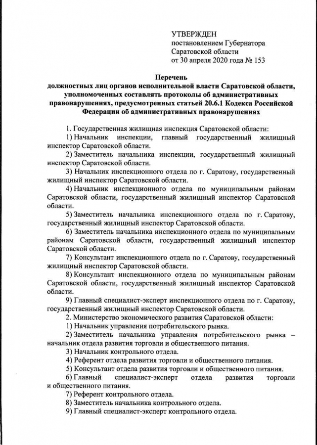 Постановление действует до конца года, оно наделяет правом составлять протоколы 38 должностных лица: это руководитель и сотрудники Госжилинспекции, министерства экономического развития, министерства строительства и ЖКХ, министерства транспорта и дорожного хозяйства, а также Гостехнадзора по Саратовской области.