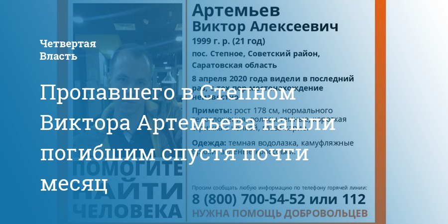 Пропавший в Советском районе Саратовской области 21-летний Виктор Артемьев найден погибшим. Об этом сообщает поисковый отряд «Лиза Алерт».