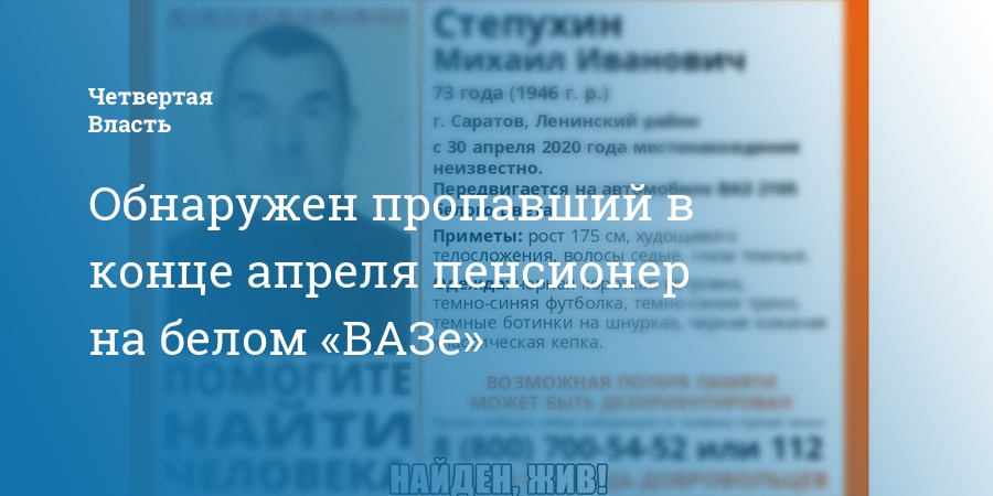 В Саратове найден живым пропавший без вести 30 апреля 73-летний Михаил Степухин. Об этом сообщает поисковый отряд «Лиза Алерт».