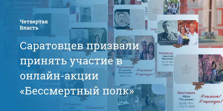 «Уважаемые Саратовцы, сегодня народная акция «Бессмертный полк» состоится в уникальном для нас всех онлайн-формате. Мы с вами привыкли 9 мая собираться в центре города и проходить с портретами наших героических родственников в одном строю. Но санитарно-эпидемиологическая ситуация не дает нам собраться всем вместе на улицах города. Чтобы принять участие в шествии всеми любимой акции, нужно разместить фотографию участника Великой Отечественной войны на специальных площадках: 2020.polkrf.ru, ok.ru/app/immortal-regiment, vk.com/polk_app, sber9may.ru. Сделать это очень просто, главное заполнить графы: фамилию, имя, отчество вашего родственника и прикрепить фотографию. Сбор заявок заканчивается 9 мая в 15:00 по московскому времени. Каждый участник акции, отправивший заявку и фото своего ветерана, получит на электронную почту письмо от организаторов, в котором будет указано точное время, когда именно во время трансляции покажут фото его героя.