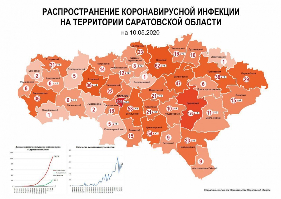 Далее максимальное число лабораторно подтвержденных случаев коронавируса с начала пандемии в регионе распределяется следующим образом: Саратов - 209 случаев, Ершовский район - 126 случая, Аткарский, Вольский, Энгельсский, Краснокутский и Балаковский районы – 47-86 случаев, Балашовский, Пугачевский, Ртищевский, Перелюбский, Балтайский, Татищевский, Новоузенский, Советский районы – от 20 до 40 случаев.