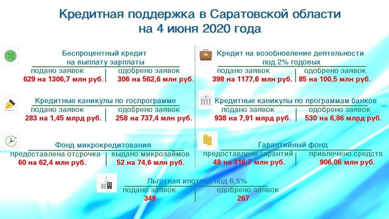 В Саратовской области одобрили выдачу 306 заявок на выдачу беспроцентных кредитов на выплату зарплаты на общую сумму 562,6 млн рублей. Такие сведения на 4 июня предоставил оперативный штаб правительства области по профилактике распространения коронавируса.