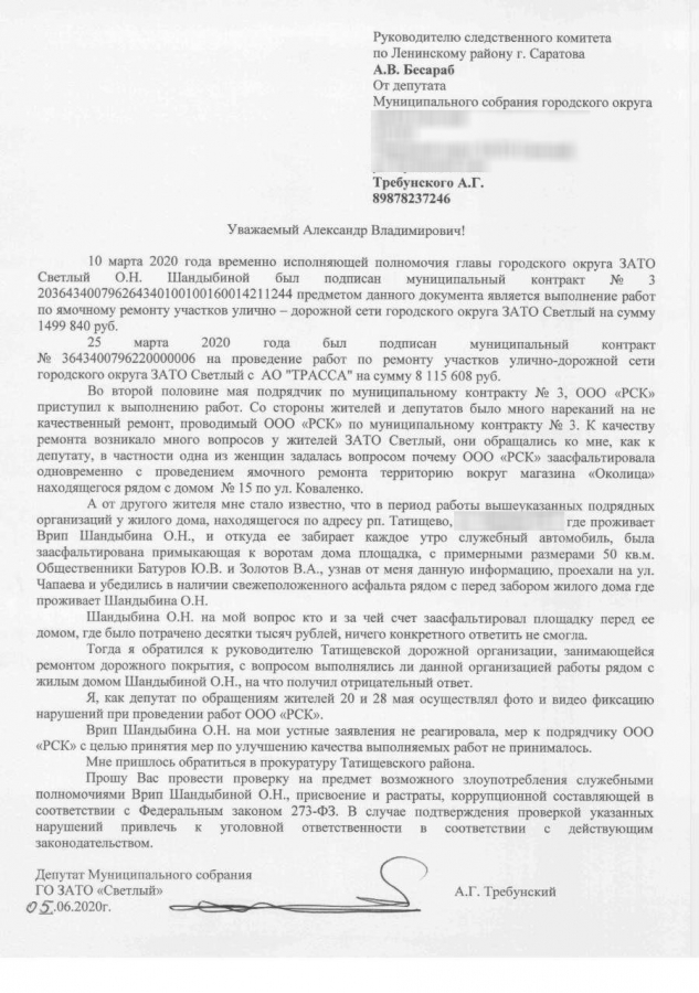 В итоге депутат обратился с заявлением в Татищевскую прокуратуру с целью проверки соблюдения качества ямочного ремонта подрядчиком. В другом обращении – в региональное СУ СКР - Требунский просит изучить возможное злоупотребления служебными полномочиями врип Шандыбиной. Требунский не исключил, что имеет место присвоение или растрата, а также коррупционная составляющая. Возможных виновных лиц он просит привлечь к уголовной ответственности.