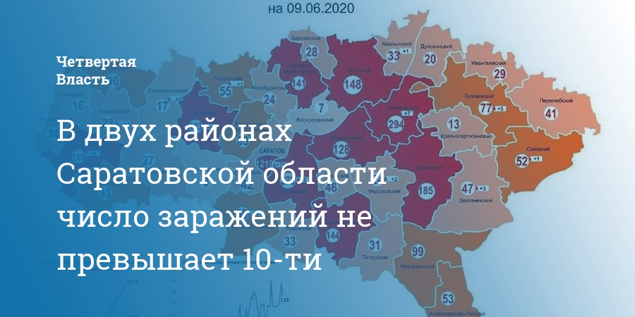 В двух районах Саратовской области – Лысогорском и Воскресенком - число заразившихся коронавирусом не превышает 10 человек. Это следует из карты распространения COVID-19 в Саратовской области по данным на 9 июня.