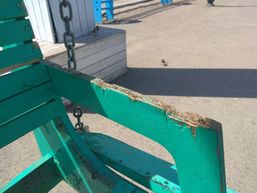 Они, к сожалению, лишились своего привычного шарма: двое из трех качелей пропали, из сидения оставшихся торчат ржавые саморезы. Время не пощадило и опоры – колонны. Кое-где отвалились доски, остальное пространство заполнили граффити уличных вандалов. В целом можно сказать, что этот участок набережной заброшен.